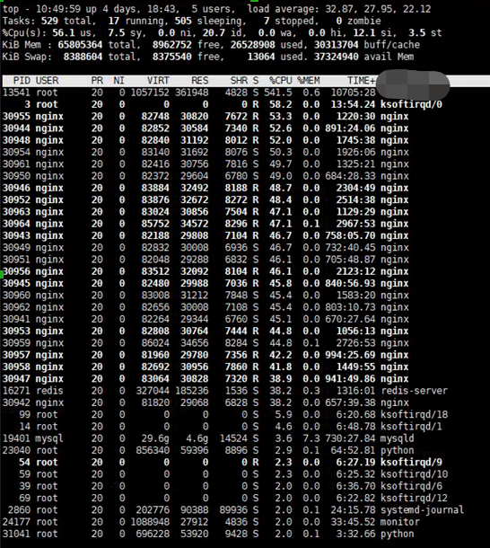 The testing environment was built on a KVM, and it was assigned 24 CPU cores. In top output, ksoftirqd/17 occupied 98% CPU. ksoftirqd is used to handle the interrupt from hardware, so maybe this process is the bottleneck of the system.